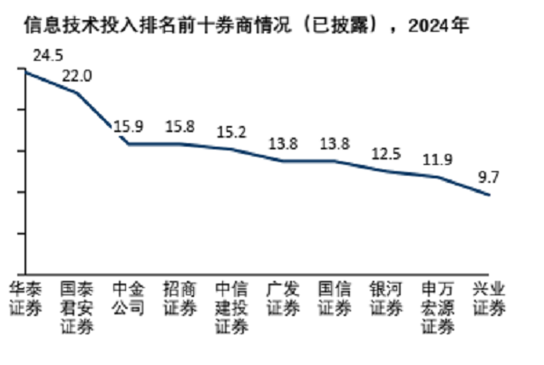随着AI技术的持续发展,各大券商也在纷纷加大技术的投入。根据2024年技术投入的费用数据显示,华泰证券以24.5亿元,国泰君安(22亿元),成为行业投入的第一梯队;而中金公司、招商证券、广发证券和国信证券分别凭借15.9亿元、15.8亿元、13.8亿元和13.8亿元的投入成为第二梯队;银河证券、申万宏源证券、兴业证券等机构也在加大投入,体现出数字化投资是大势所趋。